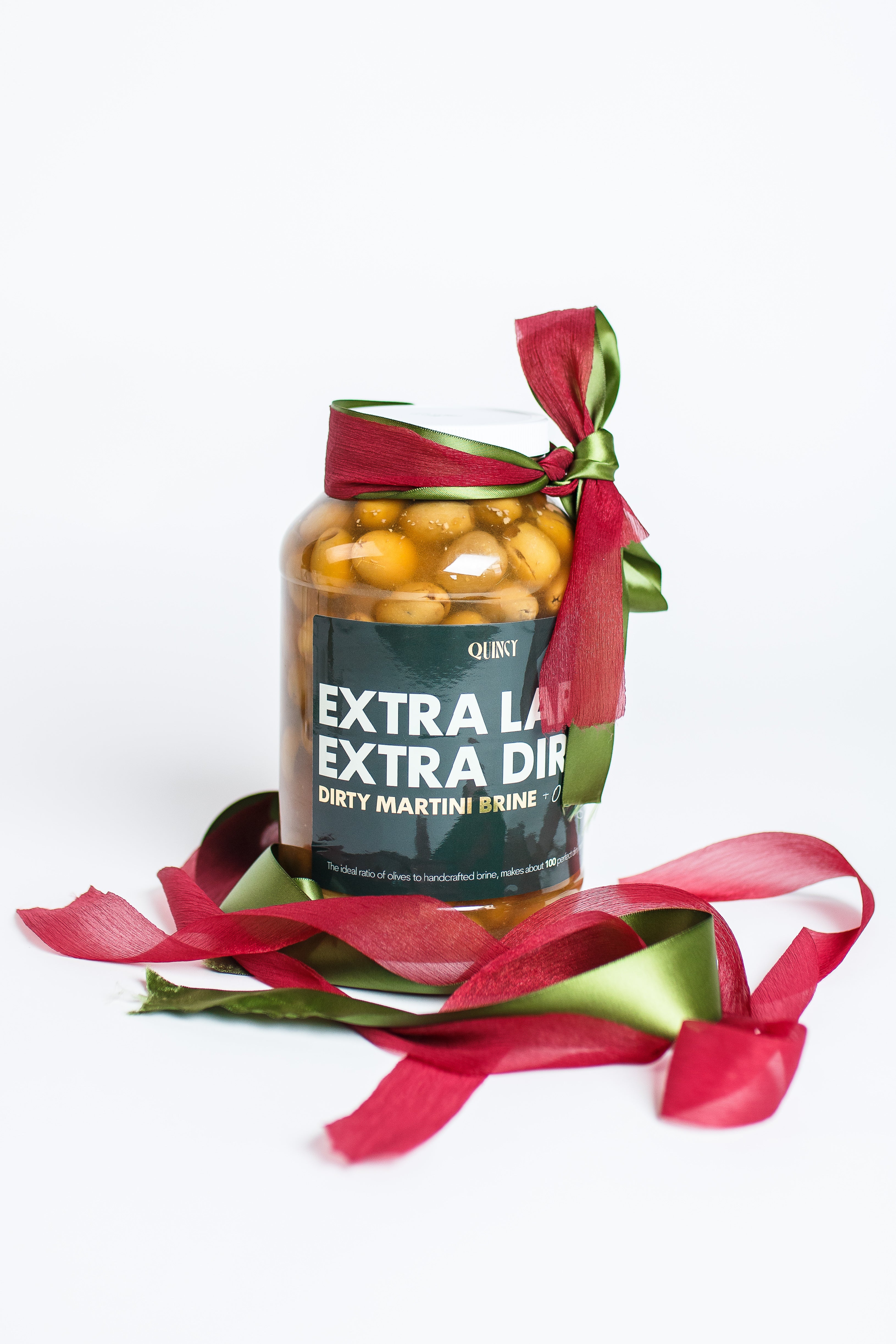 Introducing Quincy XL. With 150 pitted, Spanish Queen olives and 70 oz. of from-the-barrel brine, each gallon makes ~100-120 dirty martinis.